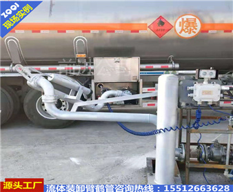*典型的槽车底部装卸鹤管,与槽车用快速接头或者法兰联接,采用五个旋转接头。介质由槽车卸油口经鹤管自上而下流入管线内,采用重力作用下的自流方式就可卸车,接口高度较高时